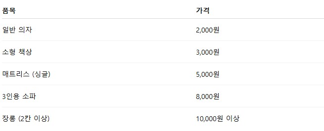 대형폐기물은 무게, 부피, 재질에 따라 가격이 다릅니다. 천안시청 홈페이지 기준, 주요 품목별 예상 가격은 아래와 같습니다.