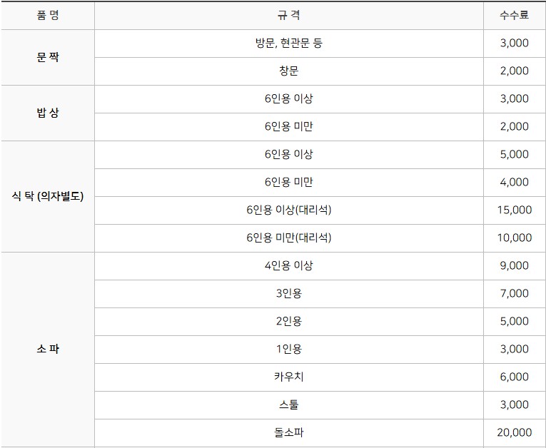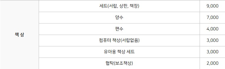 - 가구류: 책상, 침대프레임, 장롱, 의자