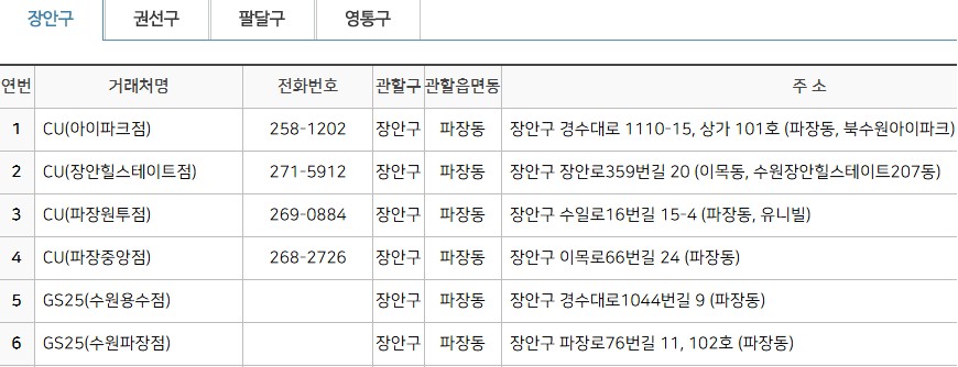 - 지정 슈퍼마켓 및 편의점 (동별 상이)