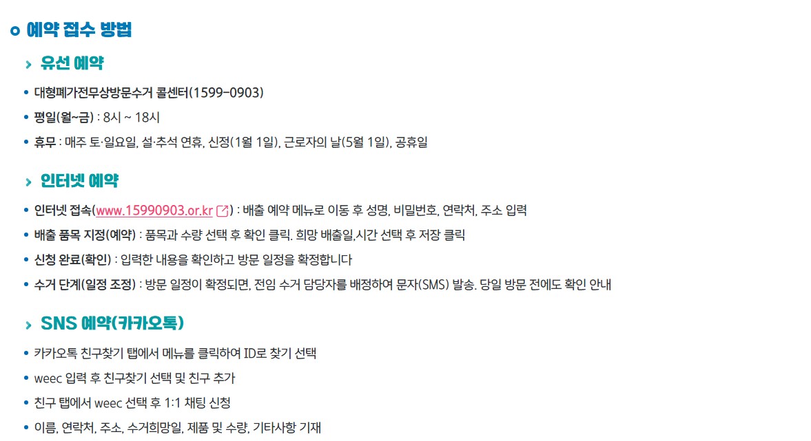 - 냉장고는 문짝 제거 후 배출 권장 (안전사고 예방)