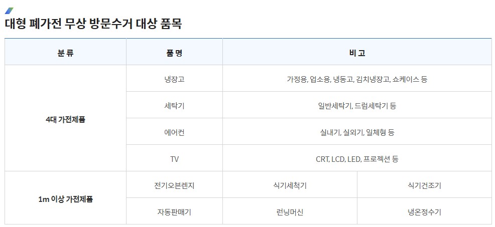 냉장고, 세탁기, 에어컨, TV 등 폐가전은 무료로 수거해 주는 서비스도 있습니다.