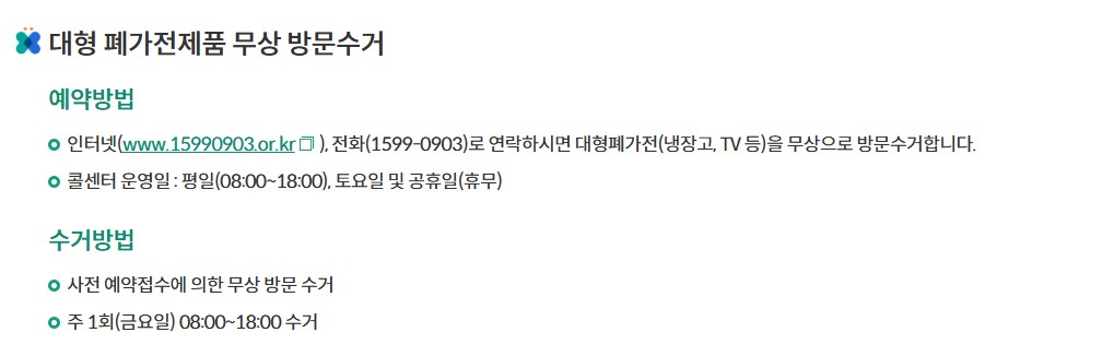고장 난 냉장고, 세탁기, TV 등 폐가전은 따로 무료 방문수거가 가능합니다. 한국전자제품자원순환공제조합에서 운영하는 시스템으로, 무겁거나 부피가 큰 가전제품을 집 앞까지 와서 가져가 줍니다.