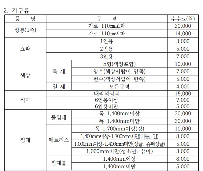 과천시의 대형폐기물 수수료는 품목에 따라 다르게 책정됩니다. 대표적인 가격은 다음과 같습니다: