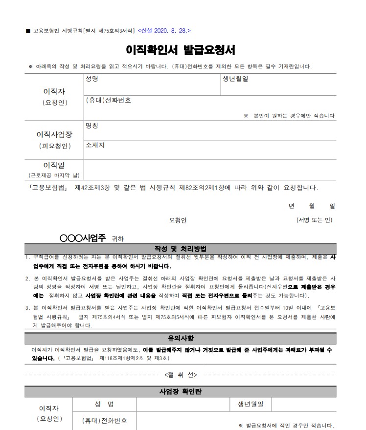 ※ 이직확인서는 요청일로부터 10일 이내에 발급해야 하므로, 퇴직 시 미리 요청해 두는 것이 좋습니다.