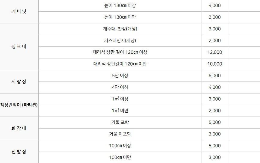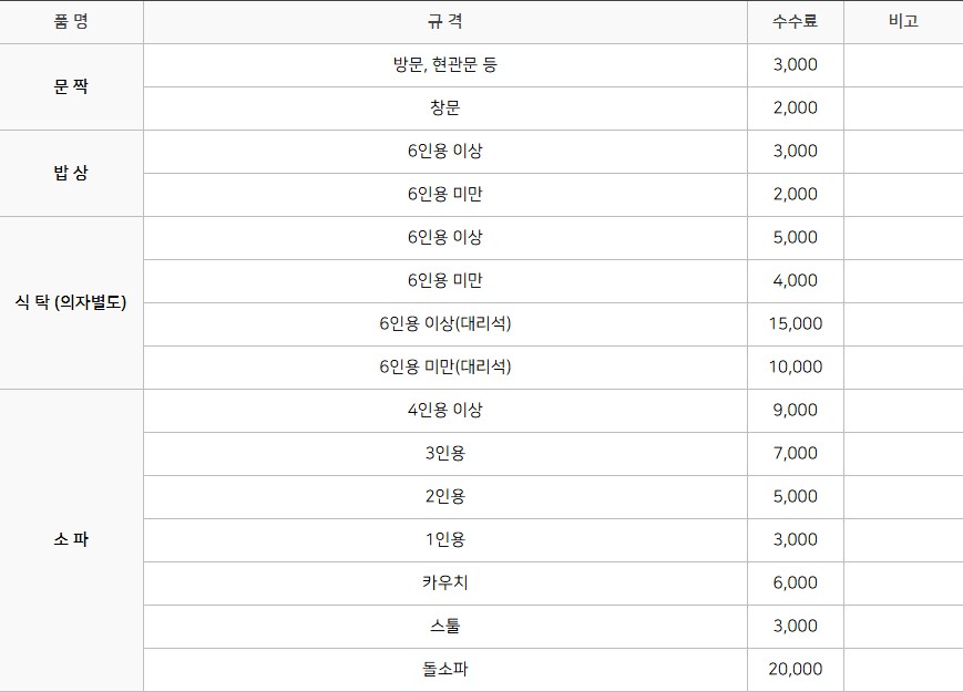 - 가구류: 침대, 옷장, 식탁, 의자 등