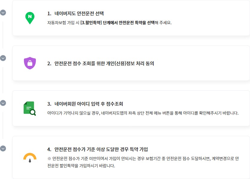 - 네이버지도 회원이어야 하며, 아이디로 연동된 안전운전 점수가 기준 이상이어야 합니다.