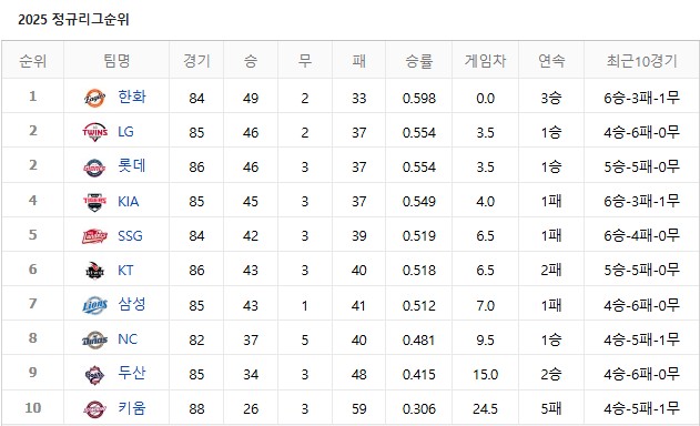 49승 2무 33패를 기록 중인 한화는 모든 면에서 안정적인 전력을 자랑합니다. 최근 10경기 6승 3패 1무, 특히 팀 평균 자책점 3.39는 리그 최상위권이며, 선발진-불펜진 모두 효율적으로 경기 운영이 이루어지고 있습니다.