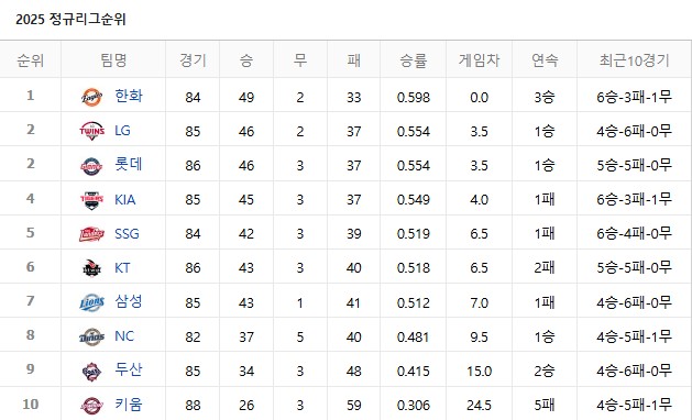 삼성은 최근 10경기 5승 5패의 성적을 기록하며 안정적이지만 뚜렷한 상승세는 없는 모습입니다. 타율은 0.266으로 나쁘지 않으나, 투수진이 흔들릴 때 실점을 한 번에 몰아주는 약점이 있습니다.