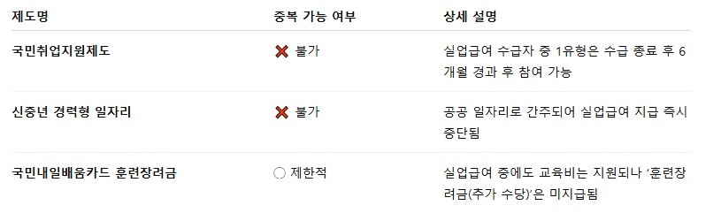 실업급여 수급 중에는 여러 가지 정부 지원 제도와의 중복 참여 또는 중복 수령이 제한됩니다. 의외로 많은 분들이 이 부분을 놓치고 있다가 불이익을 받기도 합니다.