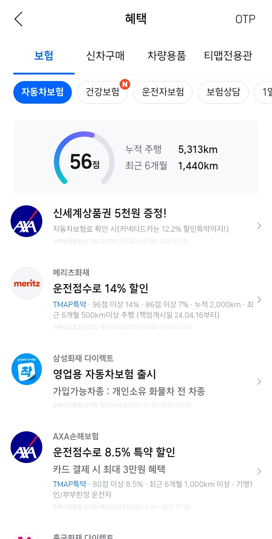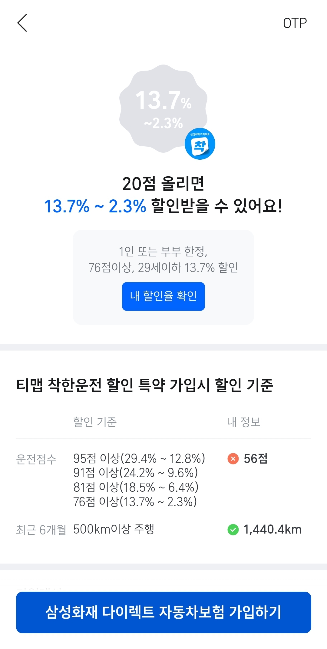 운전 점수는 100점 만점 기준으로 자동 측정되며, 가입자는 TMAP 앱 내에서 자신의 점수를 실시간 확인할 수 있습니다. 저의 운전점수는 현재 56점입니다. 점수를 올려서 혜택을 많이 받도록 안전 운전하겠습니다.
